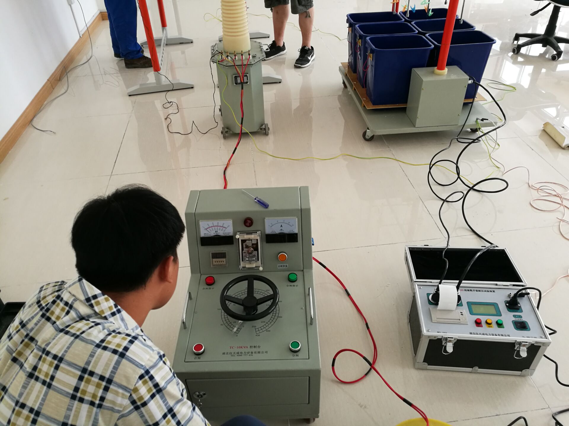 此次培訓(xùn)的設(shè)備和內(nèi)容很多,其中培訓(xùn)的主要設(shè)備是YTC1103 絕緣靴(手套)耐壓試驗(yàn)裝置。李工首先對設(shè)備的原理和功能進(jìn)行了全面而細(xì)致的講解。我公司的該設(shè)備比較先進(jìn),測試速度快,提高了工作效率;耐壓、高壓泄漏電流直讀,還可自動識別不合格試品,智能化程度高;可同時(shí)測試4雙絕緣靴(手套),并可讀取每只的泄漏電流,準(zhǔn)確判斷不合格的絕緣靴(手套);底部裝配腳輪,可隨意移動。非常方便。
