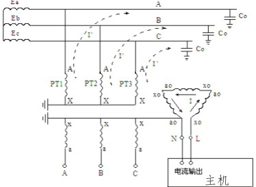 測試儀是從PT 開口三角側來測量配網的電容電流的。其測量原理如圖所示。