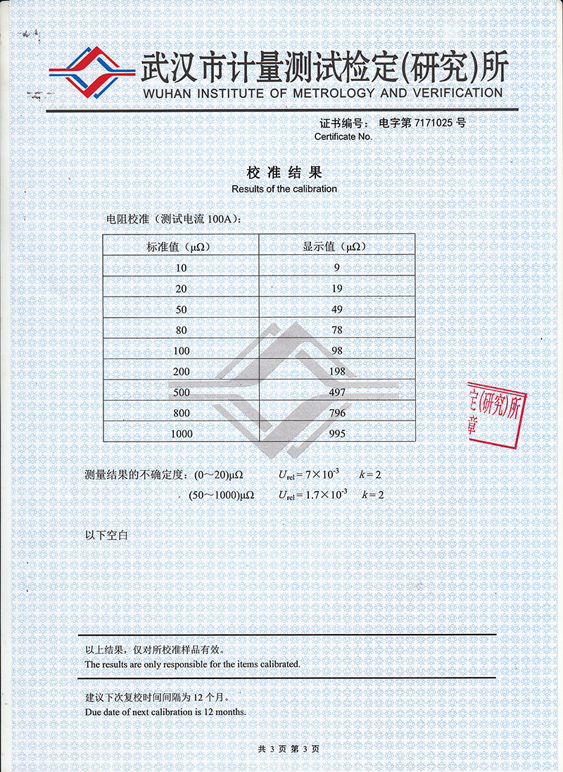 3、高精度:采用雙路高速16位Σ-Δ AD采樣,新的數字信號處理技術,分辨力達到0.01μΩ,是目前國內能達到0.01μΩ分辨力且十分穩定的接觸電阻測試儀,性能超過了進口大電流微歐計。
