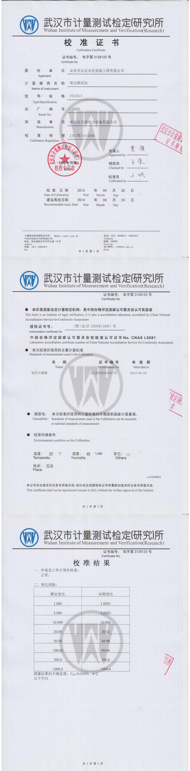 YTC3317全自動變比組別測試儀資質證書