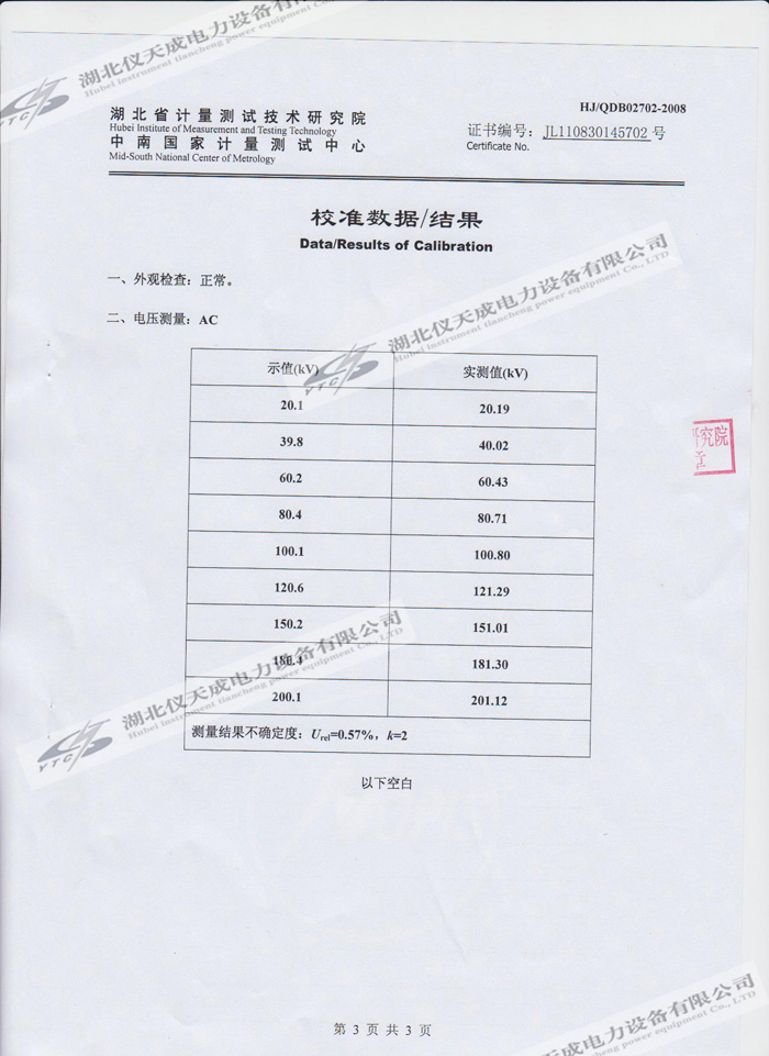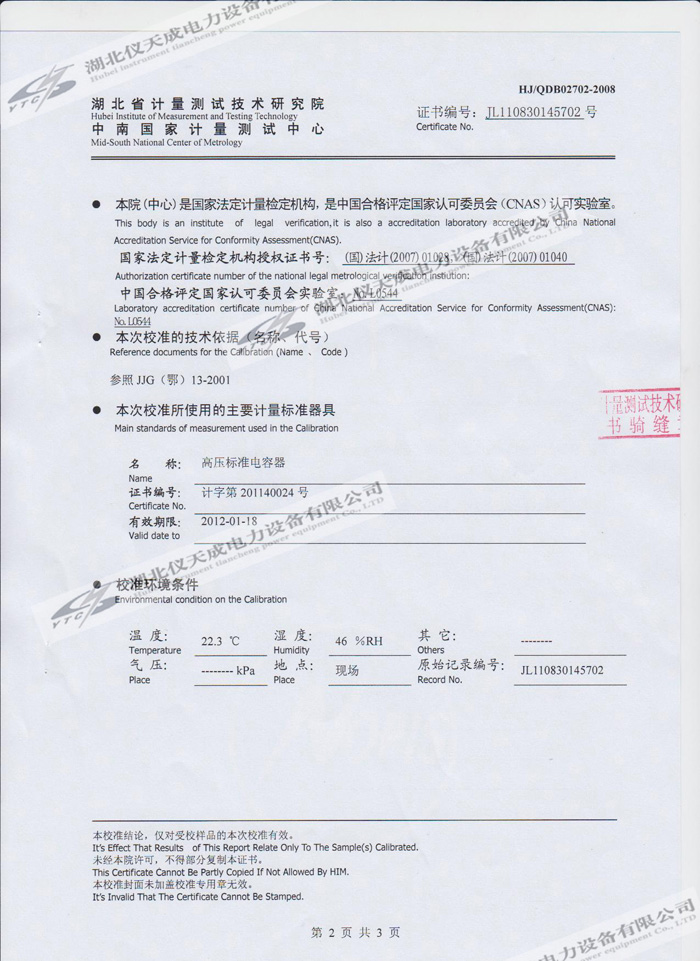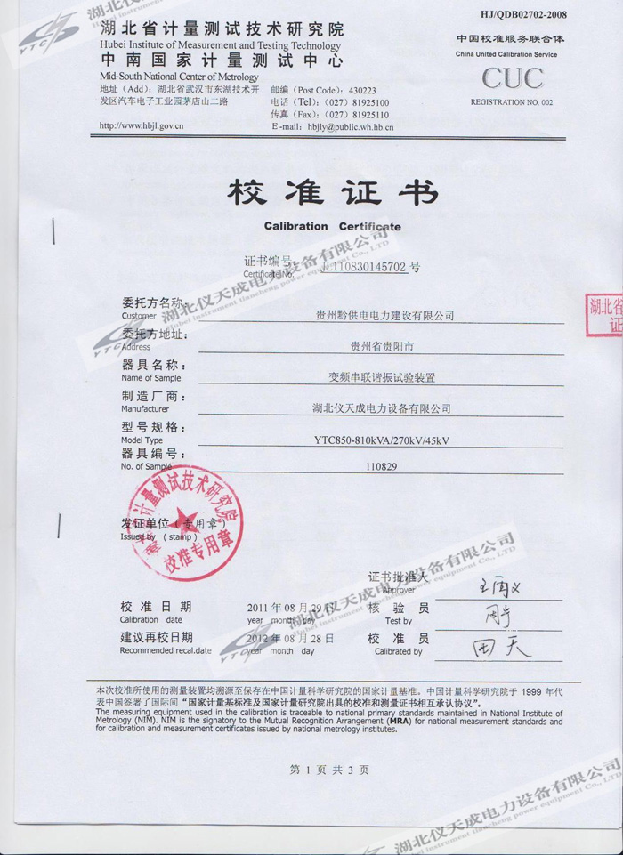 轉(zhuǎn)載:"YTC850-810kVA/270kV/45kV變頻串聯(lián)諧振試驗(yàn)裝置的資質(zhì)證書" 請(qǐng)注明來源于儀天成電力。 更多技術(shù)問題請(qǐng)致電儀天成電力客戶服務(wù):027-87876585,技術(shù)部專線:027-87876585,在線客服:719388481