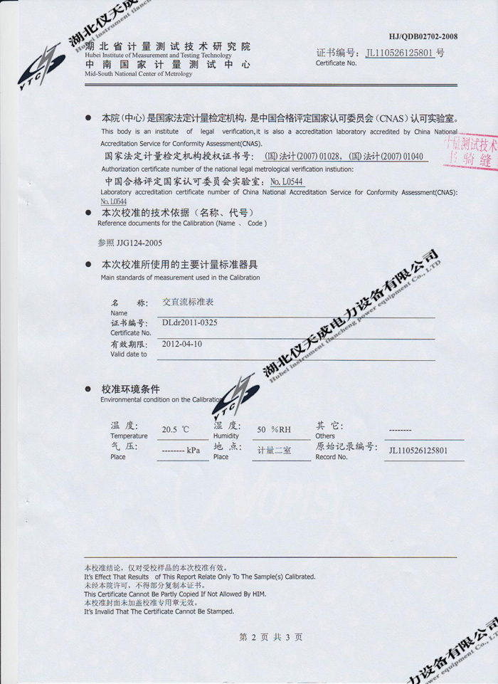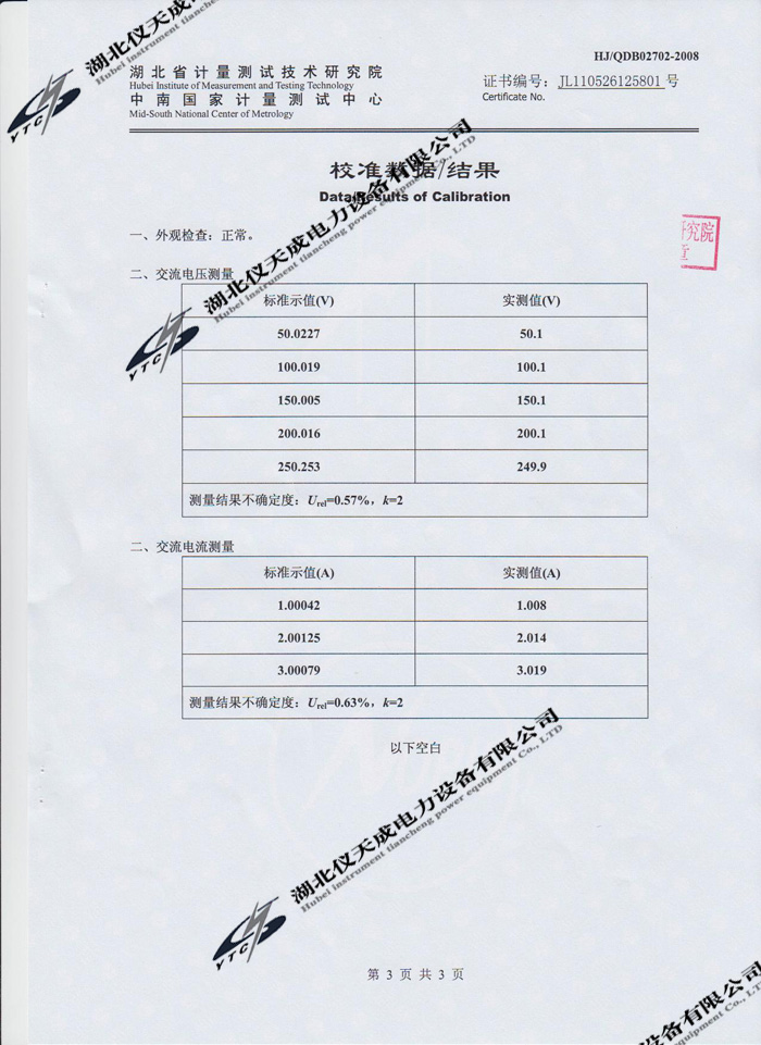 YTC3100變壓器特性及容量測試儀的資質(zhì)證書